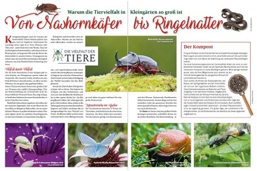 Artenvielfalt und Biotope sind nicht nur ein Thema für uns Berliner. Nein, sie sind ebenso ökologisch wichtig für andere Bundesländer, denn überall können Kleingartenanlagen ein Hotspot der Artenvielfalt sein. Die Herausgeber der Verbandszeitschrift ‚Gartenfreund‘ haben daher beschossen, im überregionalen Teil eine Serie zur Tiervielfalt zu starten. Und so beginnt die Reihe jetzt mit „Von Nashornkäfern und Ringelnattern“ auf fünf Seiten.